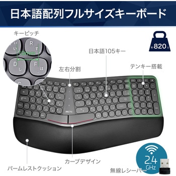 ワイヤレス 2.4GHz エルゴノミクス キーボード