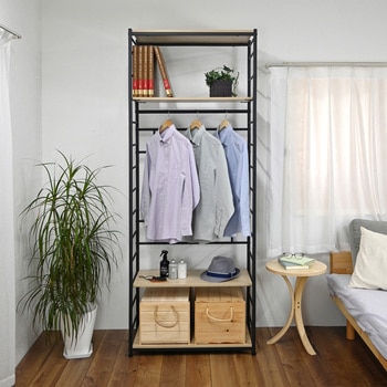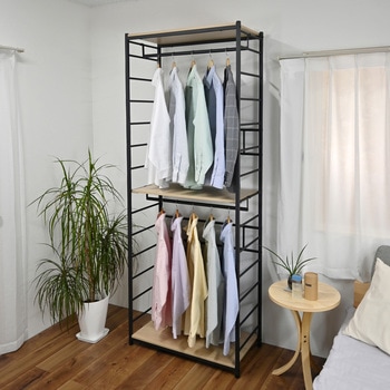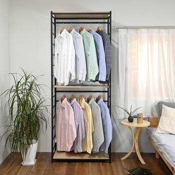 可動式棚板が2枚付属。収納する衣類や小物に合わせて、お好みの位置に棚板やハンガー棒をセットできます。