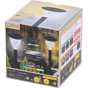 ソーラー充電式のガーデンライト。センサー式で人が近づくとさらに明るくなる。スイッチひとつで昼白色と電球色の切替ができる。スマートライティング搭載で最大40時間連続点灯(その日の夜の天気・明るさ・残りの蓄電容量を計算し点灯をコントロール)。1回の満充電で雨天・曇天でも翌日、翌々日も点灯。