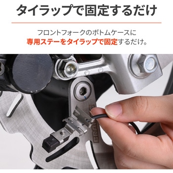 ほとんどの車両からスピードメーターパルスを発生させることができる非接触センサー。取り付けはフロントフォークのボトムケースに専用ステーをタイラップ等で固定するだけの簡単設計。車体メーターが機械式スピードメーターで、電気式スピードメーターが使えなかった方にお薦めです。