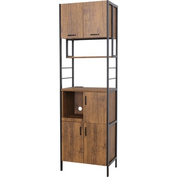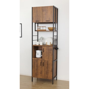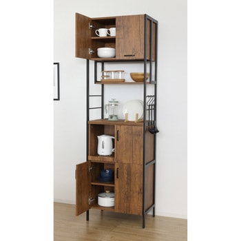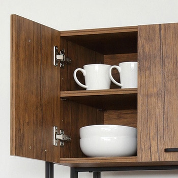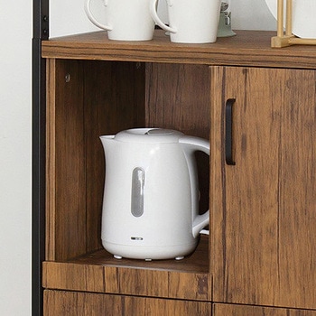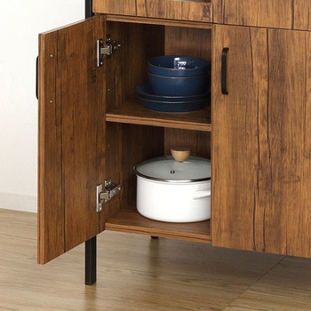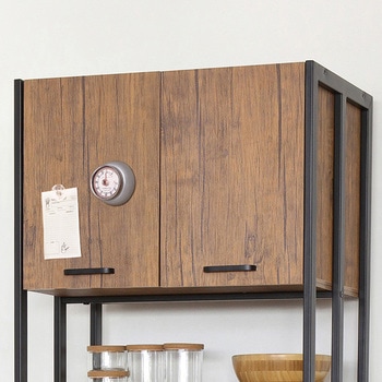 扉収納が4ヶ所あり、たっぷり収納できます。1500W 2口コンセント付。凹凸のあるエンボス加工で高級感があり、合成樹脂ですので傷がつきにくくお手入れが簡単です。シンプルで使いやすいスチール製の取手。扉内は可動棚付で、収納物に合わせて高さを変えられます。上段扉はマグネットが付く仕様なので、レシピやメモを貼って便利に使えます。