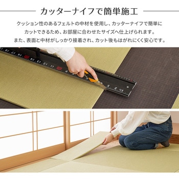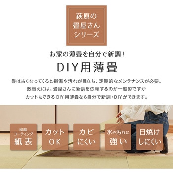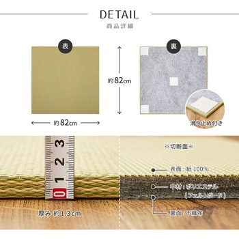 サイズ直しのカットができ、軽量で取り扱いも簡単。ぜひお家の薄畳をDIYで交換してみてください。樹脂でコーティングされた紙表で、水や汚れに強くお手入れしやすいため、お子様やペットのいるご家庭でも安心!また、日焼けや色褪せなどによって変色しにくいのも嬉しいポイントです。裏面に滑り止めが付いているので、床に直接置いて置き畳としてもお使いいただけます。