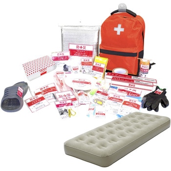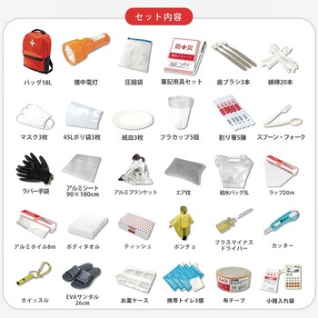 リュックサック、緊急用ホイッスル、2WAYドライバー、カッター、圧縮袋、予備袋、筆記用具セット、歯ブラシ×3本、綿棒×20本、マスク×3枚、携帯トイレ×3個、45Lポリ袋×3枚、紙皿×3枚、プラカップ×5個、割り箸×5膳、スプーン・フォークセット、2WAY懐中電灯、ラバー手袋、お薬ケース、布テープ、レインポンチョ、サンダル、アルミシート、アルミブランケット、エア枕、非常用給水バッグ、ラップ、アルミホイル、ボディタオル、ティッシュ