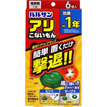 カンタン置くだけ!3種の糖を配合したバルサン独自の毒餌剤餌。容器にセット済みなので開封後すぐに使用できます。風に強い※両面テープ・ピン付き。軒下・プランター周辺に ピンで上から押し込む。玄関周りにテープで裏面に貼る。ベランダ・窓ぎわ・プランター 室外機周辺などにも!効果は約1年間!(使用環境により異なります)
