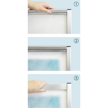 【ポスターの交換方法】上下2辺のフレームを開き、ポスターとアクリルカバーを片側に差し込むようにセットし、上下2辺のフレームを閉めアクリルカバーを固定します。
