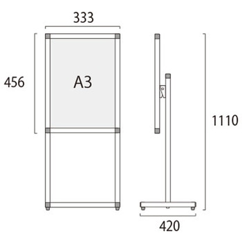 用途【展示角度を調節可能】展示するポスターの内容に合わせて、展示パネルの傾斜角度を0~35度まで調節できます。遠方からのアイキャッチ重視なら垂直展示、近くでじっくり見せたいなら見下ろせる傾斜展示がおすすめです。角度の調節は工具も必要なく簡単に行えます。【ポスターの交換方法】ポスターの交換は、本体上部の左右にあるビスを取り外し、上辺のフレームを引き抜いて面板とアクリルカバーの間にポスターをセットするだけです。【キャスター付きオプション】移動に便利なキャスター付きオプションもございます。(ご注文時にお申し付け下さい)材質パネル・本体:アルミ押出し材/アルマイト仕上(シルバー)、脚部:縦パイプ/アルミ押出し材/アルマイト仕上(シルバー) 横パイプ/ステンレスパイプ #400(シルバー)、面板:アルミ複合板(白)3mm厚、表面カバー:アクリル 透明1.5mm厚幅(mm)333質量(kg)4.5色シルバー高さ(mm)1110奥行(mm)420内容量1台(4.5kg)