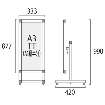 用途【展示角度を調節可能】展示するポスターの内容に合わせて、展示パネルの傾斜角度を0~35度まで調節できます。遠方からのアイキャッチ重視なら垂直展示、近くでじっくり見せたいなら見下ろせる傾斜展示がおすすめです。角度の調節は工具も必要なく簡単に行えます。【ポスターの交換方法】ポスターの交換は、本体上部の左右にあるビスを取り外し、上辺のフレームを引き抜いて面板とアクリルカバーの間にポスターをセットするだけです。【キャスター付きオプション】移動に便利なキャスター付きオプションもございます。(ご注文時にお申し付け下さい)材質パネル・本体:アルミ押出し材/アルマイト仕上(ブラック)、脚部:縦パイプ/アルミ押出し材/アルマイト仕上(ブラック) 横パイプ/ステンレスパイプ #400(シルバー)※ブラックシリーズの脚部横パイプはシルバーです。、面板:アルミ複合板(白)3mm厚、表面カバー:アクリル 透明1.5mm厚幅(mm)333質量(kg)5.2色ブラック高さ(mm)990奥行(mm)420内容量1台(5.2kg)