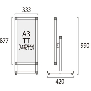 用途【展示角度を調節可能】展示するポスターの内容に合わせて、展示パネルの傾斜角度を0~35度まで調節できます。遠方からのアイキャッチ重視なら垂直展示、近くでじっくり見せたいなら見下ろせる傾斜展示がおすすめです。角度の調節は工具も必要なく簡単に行えます。【ポスターの交換方法】ポスターの交換は、本体上部の左右にあるビスを取り外し、上辺のフレームを引き抜いて面板とアクリルカバーの間にポスターをセットするだけです。【キャスター付きオプション】移動に便利なキャスター付きオプションもございます。(ご注文時にお申し付け下さい)材質パネル・本体:アルミ押出し材/アルマイト仕上(シルバー)、脚部:縦パイプ/アルミ押出し材/アルマイト仕上(シルバー) 横パイプ/ステンレスパイプ #400(シルバー)、面板:アルミ複合板(白)3mm厚、表面カバー:アクリル 透明1.5mm厚幅(mm)333質量(kg)5.2色シルバー高さ(mm)990奥行(mm)420内容量1台(5.2kg)