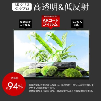 光透過率94%以上で、画面の色や鮮明さをそのまま維持します。低反射加工により、映り込みや反射を軽減します。