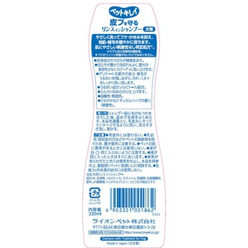 やさしく洗ってフケ・かゆみを抑える。肌にやさしい刺激性なし判定処方*。洗浄成分の100%が植物生まれ。泡立ちが豊かで泡切れもよく、愛犬の皮ふ・被毛のうるおいを残しながら、汚れ・ニオイをしっかり洗い流す。うるおい成分ソルビトール配合。ふんわりなめらかに仕上げる。弱酸性・無着色。ナチュラルハーブの香り(微香性)。