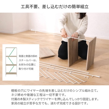 工具不要で組立可能。パーツ構造はシンプルで、棚板の穴にワイヤーフレームを差し込むだけの簡単組立。