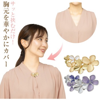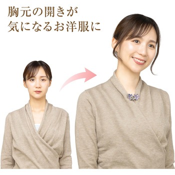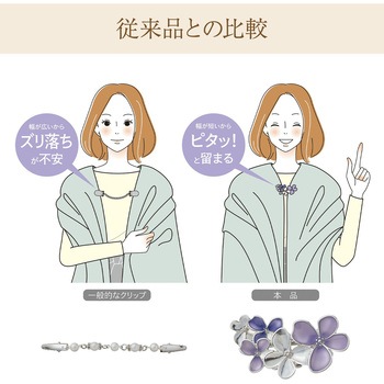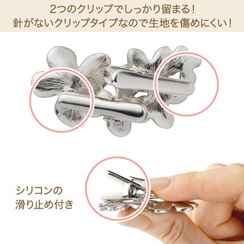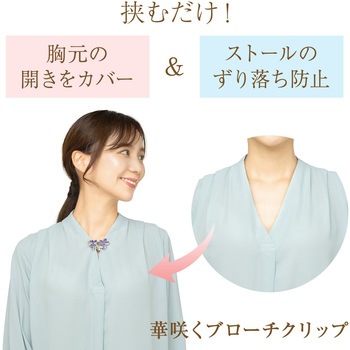 挟むだけで気になる胸元の開きをカバーショールやスカーフ、マフラー留めとしても使用可能季節を問わず使えるブローチデザイン薄手の衣類にも使える軽量タイプクリップ部分はシリコンの滑り止め付きコーディネートに合わせて選べる2色展開