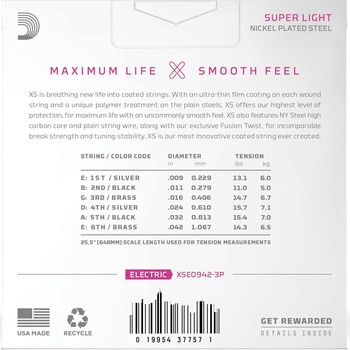 XSE0942-3P は、弾きやすさ・耐久性・音質のバランスを求めるギタリストに最適なスーパーライトゲージ弦。軽いタッチで演奏したいプレイヤーに特におすすめの高性能モデルです。