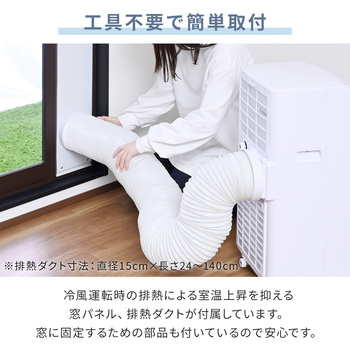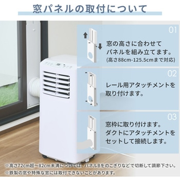 用途夏の暑さ対策に。オフィス 事務所 休憩室 小型店舗 お店 移動式エアコン スポットエアコン ポータブルクーラー 工事不要 キャスター シンプル付属品排熱ダクト、排熱ダクト用本体側継手、排熱ダクト用窓側継手、排水口アダプター、リモコン、窓パネルA、窓パネルB、レール用アタッチメント×2、スポンジテープ、窓パネル固定用部品、単4電池×2本、排水ホース質量(kg)18.8色ホワイト消費電力(W)690/720(50/60Hz)電源AC100V(50/60Hz)首振なし電源コード(m)1.8騒音値(dB)55機能切タイマー、風量調節、冷房、除湿、送風保証期間1年使用環境温度(℃)18~35寸法(幅W×奥行D×高さH)(cm)32.9×31.6×67.8設定可能温度(℃)16~31送風口数1口冷媒R32圧縮機全閉型ロータリー冷媒封入量(g)100使用環境湿度(%)30~90除湿能力(L/日)14/16(50/60Hz)冷房の目安造4畳/4.5畳、鉄筋6畳/7畳(50/60Hz)冷房能力(kW)1.4/1.6(50/60Hz)排熱ダクト有無あり内容量1台