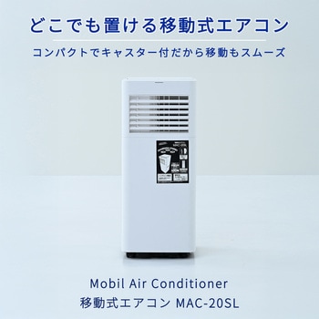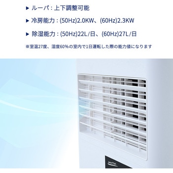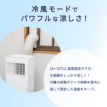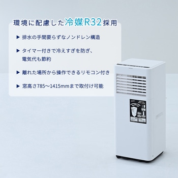 用途夏の暑さ対策に。オフィス 事務所 休憩室 小型店舗 お店 窓型エアコン ポータブルエアコン 猛暑 熱中症対策 環境 カビ 結露付属品リモコン(単4電池2本使用)×1、排熱ダクト(0.3mから1.2m伸縮タイプ)×1、排熱ダクト用本体側継手×1、窓パネル×1、窓パネル用キャップ×1、ドレンホース(ゴムパッキン付き)×1質量(kg)18色ホワイト電流(A)9.0/8.4(50/60Hz)消費電力(W)750/830(50/60Hz)電源AC100V(50/60Hz)首振なし電源コード(m)2騒音値(dB)56/57(50/60Hz)機能風量調節、冷房、除湿、送風寸法(幅W×奥行D×高さH)(cm)28×28×67.5送風口数1口冷媒R32圧縮機全閉型ロータリー(定格出力:0.525kW)冷媒封入量(g)175除湿能力(L/日)22/27冷房能力(kW)2.0/2.3排熱ダクト有無あり内容量1台