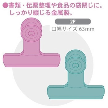カラー塗装された金属性クリップです。口幅63ミリ。ピンク、ミント各1個入り。