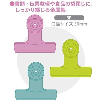 カラー塗装された金属性クリップです。口幅50ミリ。ピンク、イエローグリーン、ミント各1個入り。