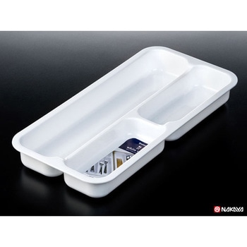 3分割された白色のトレー。カトラリーを入れるスペースが1つ、小物を入れるスペースが2つ。