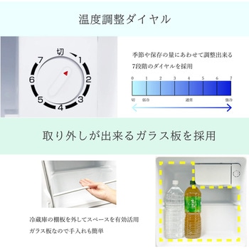 コンパクトなのに大容量。大容量収納で、2L ペットボトル、缶や瓶もラクラク入ります。本体内部右上に氷を作れる製氷室を搭載。7段階で温度調節可能なダイヤル付き。