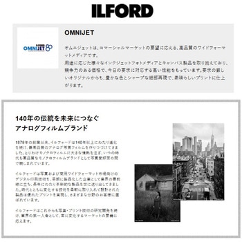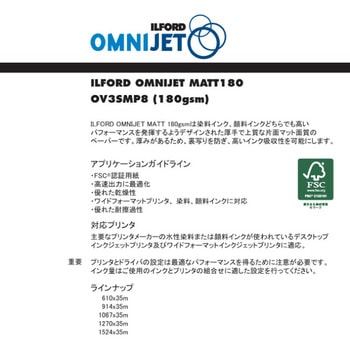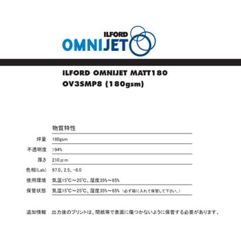 オムニジェット マット180は坪量180g/m2、厚さ210μmの厚手タイプの紙ベースのマットペーパーです。ILFORD OMNIJET MATT 180gsmは染料インク、顔料インクどちらでも高いパフォーマンスを発揮するようデザインされた厚手で上質な片面マット面質のペーパーです。厚みがあるため、裏写りを防ぎ、高いインク吸収性を可能にします。