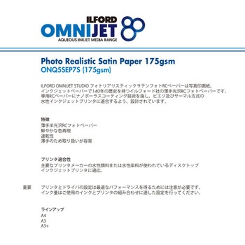高い光沢感により美しい発色と優れた画像品質が特長です。 イルフォード オムニジェットスタジオ グロッシー 200gsmよりさらに薄手のペーパーのためファイリングやブッキングに便利です。