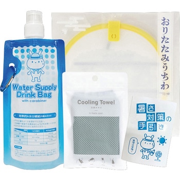 カラビナ付給水ドリンクバッグ・おりたたみうちわ・涼感タオル・暑さ対策の手引き