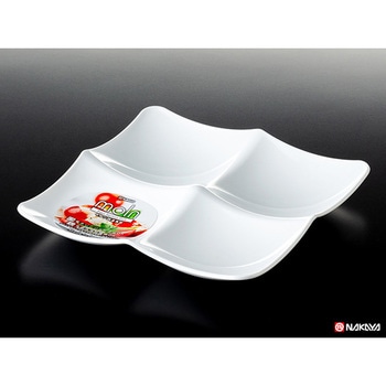 磁器のような風合いで、4つに分かれている仕切り皿。スタッキング性が高く、複数枚でもコンパクトに収納が可能。電子レンジあたため、食器洗浄乾燥機使用可。