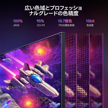 KOORUI G2741Lは27インチ IPSパネルを搭載した4Kゲーミングモニターです。 4Kで160Hzのリフレッシュレート、広々とした画面領域、スタッタリングのないゲームプレイが特長です。 FHDで320Hz高リフレッシュレートが楽しめます。 デュアルモード対応で、4K@160Hz ?FHD@320Hzに切り替え可能です。 4Kの高解像度がより没入感のあるゲーム体験を実現し、320Hzの高リフレッシュレートが迅速な判断を可能にし、1ミリ秒高速応答速度で、FPSや格闘ゲームの高速動作もなめらかに再現しました。 より滑らかでスムーズな映像を楽しめて、AdaptiveSync機能により、画面のテアリングや、ゲームプレイ中のスタッタリングの心配はありません。 178°広視野角の非光沢Fast IPSパネルを採用し、DCI-P3 95%、sRGB 100%の広色域と10億7000万の表示色で、より豊かで忠実な色を再現しました。 200000:1コントラスト比、350nit(SDR)の高輝度とHDR400機能加えて、一貫性のある正確な色とリアルなビジュアルを体験できます。