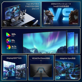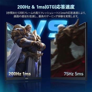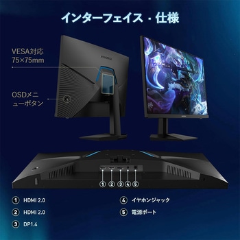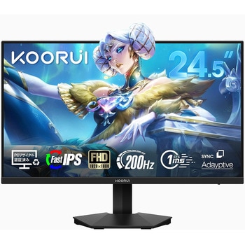 KOORUI G2511Pは24.5インチ IPS 200Hz FHDゲーミングモニターです。 200Hzの高リフレッシュレートと1ms(GTG)応答速度により、動きの速いシーンでも残像を抑え、滑らかな映像表示を実現しました。 180Hzモニターよりも快適な視覚体験を提供します。 アスペクト比16:9のFHD(1920×1080)高解像度画面により映像体験が満喫、ゲームから日常使用まで幅広く活躍する24.5インチゲーミングモニターです。 Adaptive Sync対応により、映像のフレームと同期し、画面のズレやカクつきを軽減します。 フリッカーフリー技術も搭載し、長時間のゲームプレイや作業でも目への負担を抑え、快適な使用感をサポートします。 モニターの裏面にJoystickボタンが付き、応答速度など様々な機能が便利に設定できます。 178°の広視野角を持つFast IPSパネルを採用し、90%DCI-P3・100%sRGBの広色域に対応、忠実な色を再現します。 300cd/m?の輝度と約1677万色(8bit)表示に対応し、1000:1のコントラスト比で画面の隅々まで繊細で鮮やかな映像を再現します。 DisplayHDR400対応により、明部も暗部もくっきり表現し、臨場感のある映像体験を実現します。 スリムベゼルデザインを採用し、FPS/RPG/RCGなど用途別ゲームモードを搭載します。 HDMI 2.0×2、DisplayPort 1.4×1、ヘッドホンジャック×1を搭載し、PCやPS5ゲーム機などさまざまな機器に対応します。 75×75mm VESAマウント対応で、モニターアーム設置も可能です。