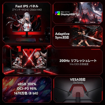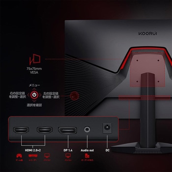 KOORUI G2721PはフルHDの約1.7倍の解像度を誇るWQHD(2560×1440)対応27インチ型ゲーミングモニターです。 Fast IPSパネルを採用し、178°の広視野角と高い色再現性を両立しました。 DCI-P3 95%・sRGB 100%の広色域と16.7M色表示により、ゲームはもちろん映画鑑賞やデザイン作業でも自然でリアルな映像を映し出します。 最大200Hzの高リフレッシュレートと1ms(OD)の高速応答により、動きの激しいFPSやアクションゲームでも残像感を抑えた滑らかな映像表現を実現しました。 Adaptive Sync(FreeSync / G-Sync互換)対応で、画面のズレやカクつきを軽減し、安定したゲームプレイ環境をサポートします。 HDR400対応により、明暗差のあるシーンも自然な階調で表現しました。 最大350nitsの高輝度設計により、日中の明るい室内でも高い視認性を確保します。 非光沢(ノングレア)パネルとフリッカーフリー設計を採用し、長時間使用時の目への負担にも配慮しています DisplayPort 1.4(x1)とHDMI 2.0(x2)を搭載。ゲーミングPCからノートPC、PS5/Xboxまで、複数のデバイスを同時に接続可能です。