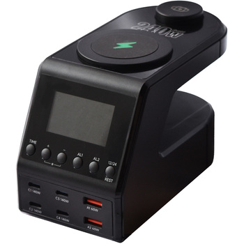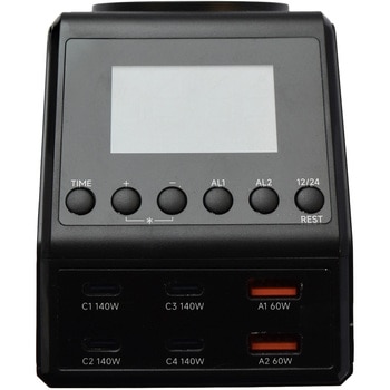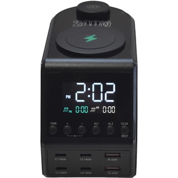 高出力240W!パワフルで効率的な充電が可能!デジタル時計+ワイヤレス充電+USB充電の多機能一体型時計にはアラーム機能搭載画面の明るさ調節可能(4段階/5段階目で画面表示オフ)アラームは2プログラム登録可能置くだけで充電できるのでケーブル要らずApple Watchなどのスマートウォッチも充電可能USBポート×6付き(USB Type-C×4/USB A×2)耐久性/安全性に優れた高品質ABS樹脂を使用1年保証