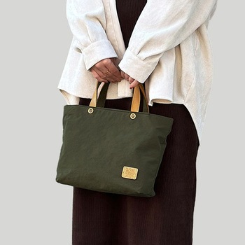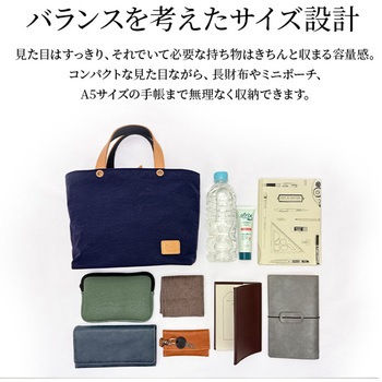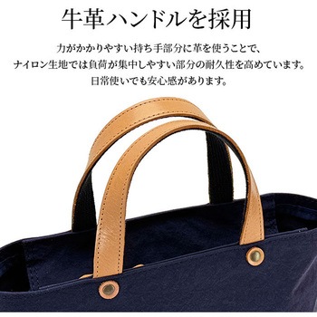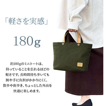 ドライな質感と硬さを併せ持つ帆布のようなナイロン生地を使用した国産ミニトート。約180gととっても軽く、くたっとせず自立するのも嬉しいポイント。急な雨でも安心の撥水加工を施しています。大人のカジュアルに寄り添う逸品です。
