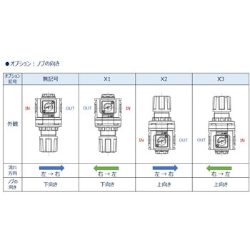 | 75750030 | R1000-8G-W-NTX2 | G1/4 | 0.16 | 標準流れ(左→右)、ノブ上向き | 圧力計なし(圧力計組立ポート(1/4)はシール状態で組立) | ノンリリーフタイプ | | |