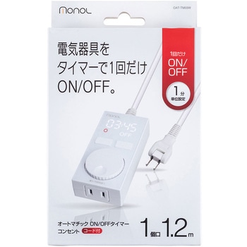 電気器具を自動で一回だけ「ON」か「OFF」にすることができます。ダイヤルを回してON かOFF を選んでスタートするだけの簡単操作。最小1分~最大23時間59分まで。1分単位で設定可能。トラッキング防止スイングプラグ採用。通電が一目で確認できるランプ付き。明るさ調整可能なLED表示パネル。雷ガード機能付き。1.2mのコード付き。