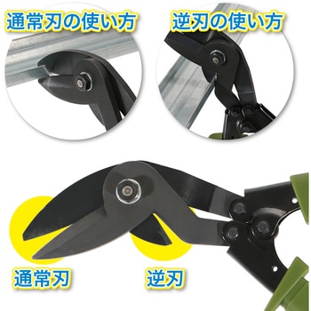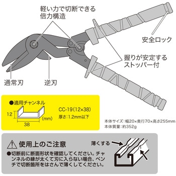 通常刃と逆刃の2種類で、多彩な切断に対応JIS規格のCチャン(1.2ミリ厚)を切断可能倍力構造で、軽くラクラク切断握りが安定するストッパー付安全ロック付適用チャンネル・CC-19(12×38) 厚さ:1.2mm以下