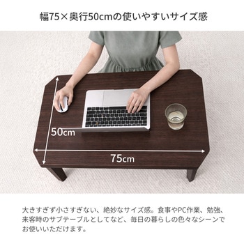 幅75×奥行50cmの、毎日使いにちょうどよいサイズ感。ノートPCとマウス、ドリンクも置けるゆったりとした広さです。