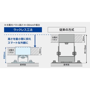 ラックレス工法により、太陽光パネル表面までの高さを最小限に抑え、スマートな外観に仕上がります。