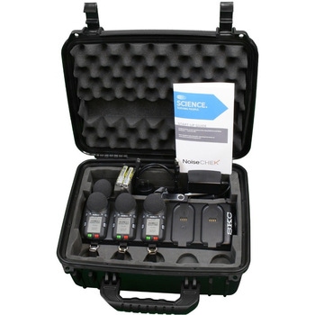 NoiseCHEK Noise Dosimeter 3-pack KitはBluetooth機能非搭載のdosimeter本体3台、電源付き5台用charging dock 1台、交換用windscreen 1個、USBケーブル1本、取扱説明書を収録したUSBドライブ1個を含み、充電機能付き保護キャリーケースに収納されています。校正には別売のAcoustiCHEK Cat. No. 703-002校正器が必要です。
