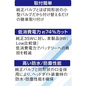 純正バルブとほぼ同形状!コントローラーレスで取付簡単!2輪車特有の強い振動に耐える20G耐振仕様!低消費電力でバッテリーへの負担を軽減!仕様・口金タイプ:HS1・JIS規格対応・高い防水/防塵性能・1年保証・12V専用(直流/交流対応)・1個入