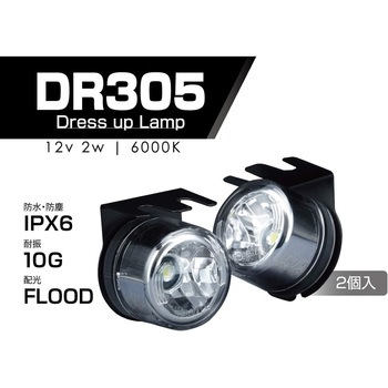 DR305使い方いろいろ!超軽量Φ30コンパクトドレスアップランプ!「ヘッドライトのサポート」「ボディ間接照明」「デイタイムランプ」などに。品番:MLL6配光/ケルビン:FLOOD/6000K仕様:12V 2W /耐震10G / 防水・防塵IPX6 / 300cd内容物:ブラケット付ランプ2個・耐震性10Gクリア・異物、水の保護等級IPX6クリア