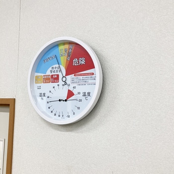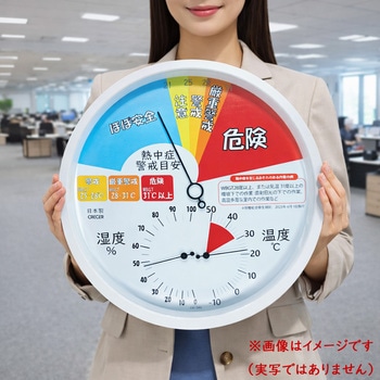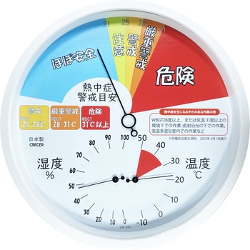 職場における熱中症対策(労働安全衛生規則 R7.6.1施行)に対して、熱中症リスクのある状態になると危険度を可視化します。日射の無い屋内でのWBGTの参考目安を表示します。WBGT(参考値)が31℃以上で危険(赤)、28℃以上で厳重警戒(橙)、25℃以上で警戒(黄色)、21℃以上で注意(黄緑)、それ未満でほぼ安全(水色)を表示します。温度が31℃以上の目盛を赤で表示しています。