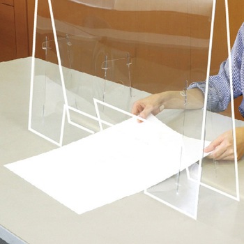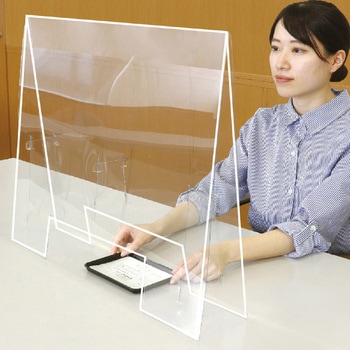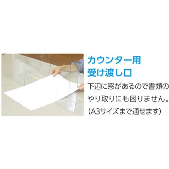 書類やものの受け渡しができる窓ありタイプアルコール消毒・洗剤拭き取りOK!角丸加工 ケガ防止のため角を丸くしています。組立簡単両面保護フィルム付1mm厚高透明度PET製特許出願中 カウンター用受け渡し口:下辺に窓があるので書類のやり取りにも困りません。(A3サイズまで通せます)