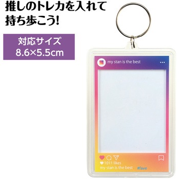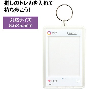 お気に入りのトレカを挟んで持ち歩ける、ワンタッチ開閉タイプのクリアキーホルダーです。フタを開けて差し込むだけの簡単仕様で、トレカの入れ替えもスムーズに行え、傷や汚れからしっかり守ります。インスタの投稿画面をイメージしたデザインで、推し活気分が高まります。バッグやリュックに付けてライブやイベントなどさまざまなシーンで活躍します。