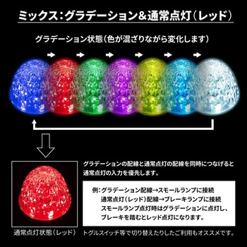 入力電源は2つあり、グラデーションで色が切り替わる点灯とレッドの選択が可能超高輝度LED 特殊なレンズ構造により鮮やかな拡散発光耐光性試験に合格した変色しにくいレンズを使用防塵防水IP67取得!! ノイズ対策済み 24V大型トラック~12V軽自動車まで対応