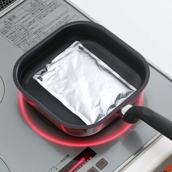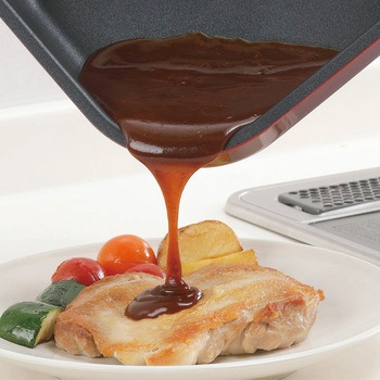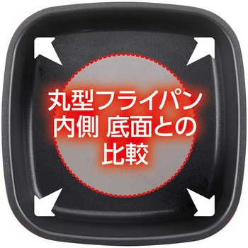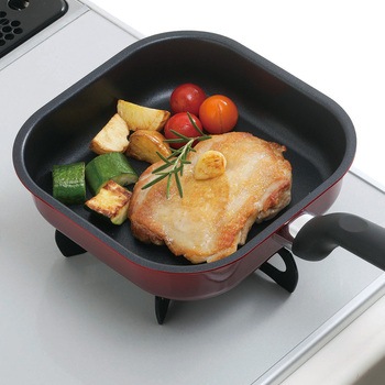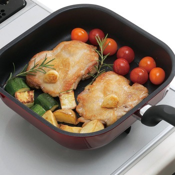 丸型フライパンより調理面積の広い角形フライパンです。ちょい深めの設計で、レトルト食品の温めなども少ない水で調理OK。角がある事でソース等も注ぎやすく使いやすくなっています。
