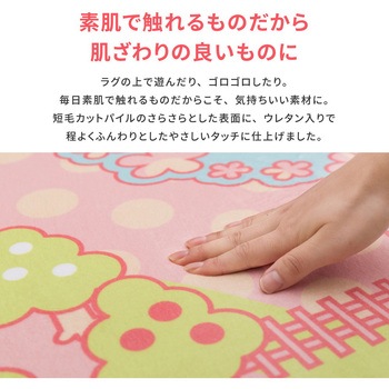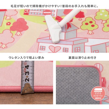 子供の遊び心をくすぐる道路柄のラグ。お手持ちのオモチャやミニカーを使って創造性豊かに自由に遊ぶことができます。デザインだけでなく使いやすさも人気の秘密!汚れてもご家庭の洗濯機で丸洗いできます。また、ウレタン入りで程よいクッション性があり、表面は毛足が短くさらさら優しいタッチ感。裏面は滑りにくい加工付き。ホットカーペットや床暖房に対応しており、オールシーズンお使いいただけます。