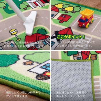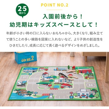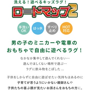 用途赤ちゃん期はプレイマット、幼児期はキッズコーナーマット・キッズラグ、小学生児童期は学習デスクマットで長く使える道路マップ柄ラグ。誕生日やクリスマスのプレゼントにも人気です。ループパイルはサラッとした感触で弾力性と耐久性があり、しっかりとした踏み心地。毛足がカットされていないため、ホコリやゴミが入り込みにくく、掃除がしやすいのもポイント。はっ水加工を施しているため飲みこぼしなどもサッと拭き取れシミになりにくく、汚れても手洗いOK。裏面は滑りにくい加工付き。ホットカーペットや床暖房に対応しており、オールシーズンお使いいただけます。内容量1個