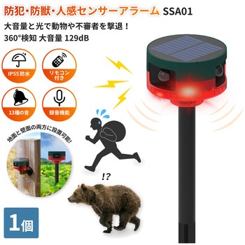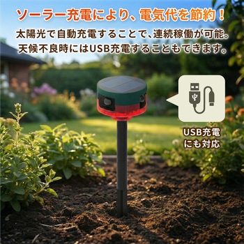 3つの赤外線センサーが360°全方位を監視。赤外線センサーが反応すると、大音量アラーム(最大129dB)と赤色点滅で注意喚起。複雑な操作を必要とせず、設置後すぐに使用できます。検知距離は最大約8mで、設置場所を選ばず、庭や畑などさまざまな環境で使用できます。13種類のアラーム音と録音機能付きで、最大15秒まで音声を録音でき、録音した音声はアラーム音として使用可能です。太陽光で自動充電することで、連続稼働が可能。天候不良時にはUSB充電することもできます。リモコンで約10~100mの遠隔操作や複数台の一括管理にも対応。地面に差し込んでの設置、壁やフェンスなどへの固定も可能。雨やホコリの影響を受けにくいIP55相当の防水設計で、屋外設置でも安心してお使いいただけます。