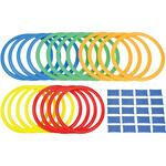 好きなコースをつくってケンケンパをしよう。材質:PE。サイズ:リング:外径275mm、内径235mm。セット内容:赤・青・黄・緑・オレンジ 各色4 計20、ジョイントパーツ×20