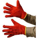 牛床革のバット部とショルダー部を使用したAグレード床革手袋。きれいな赤色に染めました。内綿付で夏はさわやか、冬は暖かい。